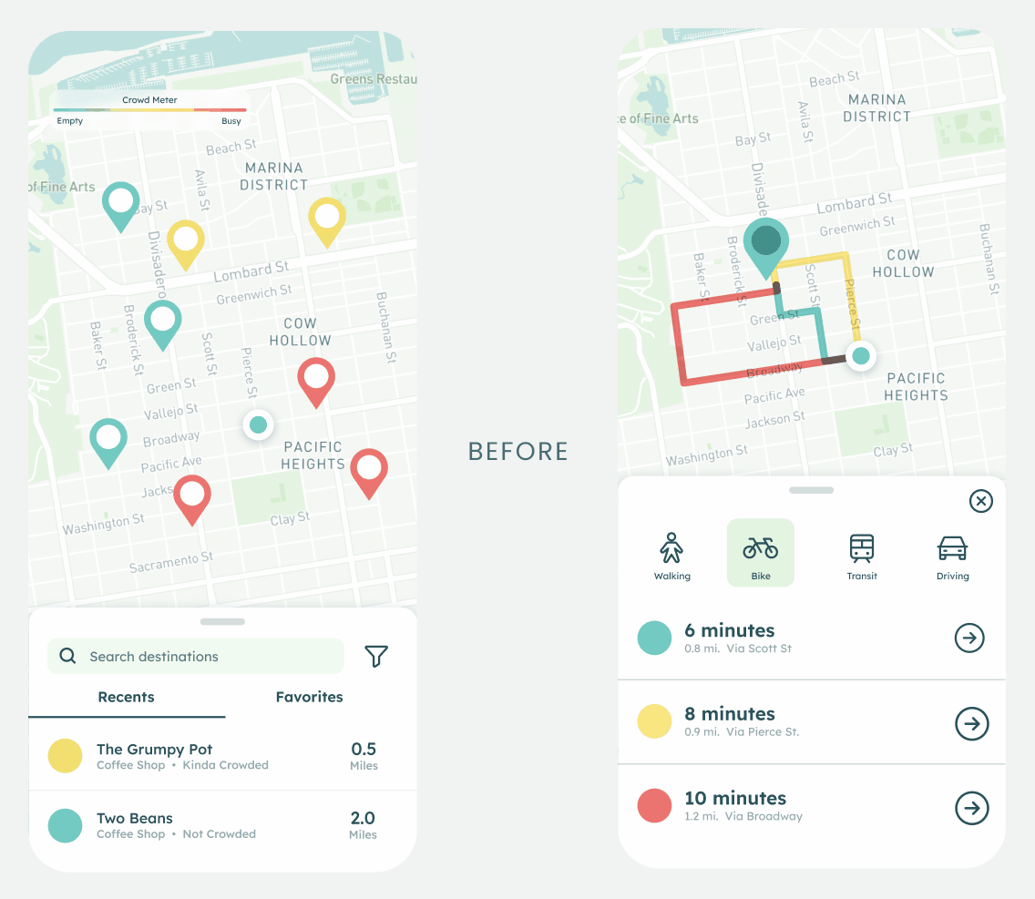 I ultimately chose a solution I labeled “Heatmap-First with Compare” as it provides Nina with all necessary information the earliest in the flow: location proximity and crowd level are immediately visible through a heatmap on the first screen.